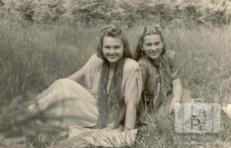 Divas draudzenes pļavā Sengvardenes nometnē (angļu zonā). No kreisās: Margita Jaunzeme un Ligita Sproģe (pr. Kalēja).