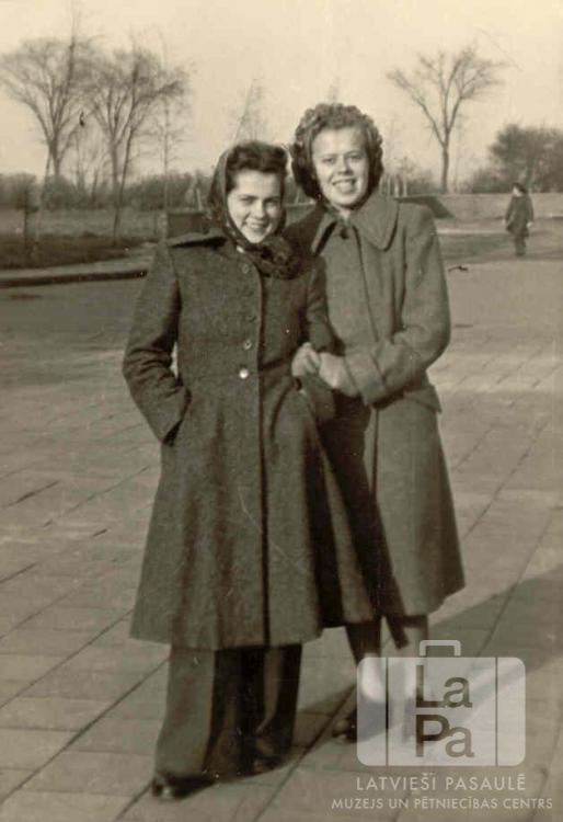 Divas draudzenes laukumā Sengvardenē (angļu zonā). Fonā garāmgājējs un koki bez lapām. No kreisās: Ligita Sproģe (pr. Kalēja) un Austra Tauriņa.