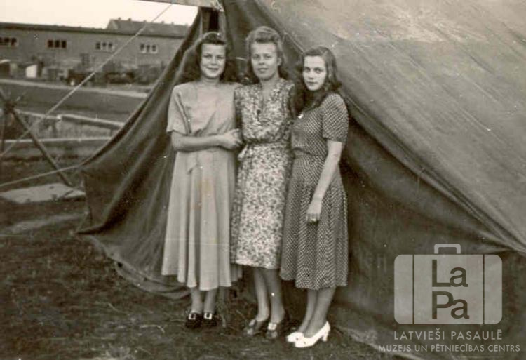 Trīs draudzenes pie telts Blombergā (angļu zonā). Fonā ir nometnes ēkas. No kreisās: Ina Luca, Austra Tauriņa un Ligita Sproģe (pr. Kalēja).