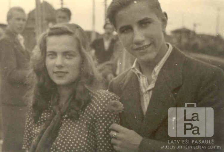 Fotogrāfijas dāvinātāja rakstītais atmiņu stāsts par bēgļu gaitām un bēgļu nometnēm: "1944. septembrī, frontei tuvojoties, vecākais brālis Artūrs pārliecināja tēvu Kārli doties bēgļu gaitās ar mani 14 g., māsu 28 g. un brāli Dzintaru 11 g. Zirgu pajūgos nonācām līdz Liepājai, bet tālāk 1944. gada novembrī bija jādodas ar kuģi uz Dancigu. Vācijā mūsu ģimeni sūtīja uz vairākām bēgļu nometnēm, beidzot nonākot Braunšveigas pilsētā, kur priekš bēgļu dzīvošanas iztīrīja vecus kavalērijas zirgu staļļus. Vēlāk bēgļus pārvietoja uz pus sabumbotu skolas ēku, kur mēs sagaidījām kaŗa beigas. Bēgļiem bija kopēja ēšanas vārīšana, kur vienu rītu zupā bija noslīkusi žurka. Labierīcībām bija izrakts grāvis ar laipu pāri. Mums, latviešiem, bija priekšrocības, mēs bumbvedēju uzbrukuma laikā drīkstējām iet uz patvertnēm, poļiem bija jāpaliek ārā. 1945. gadā Braunšveigā nodibināja DP nometni, kur mūs uzņēma. 1947. gadā māsa Alīda apprecējās, un viņi izceļoja uz Beļģijas ogļu raktuvēm. 1948. gadā mūsu ģimene pārcēlās uz Zengvardenes nometni, izņemot brālis Dzintars, kurš mācījās latviešu technikuma ģimnāzijā Ferdenē. Sākoties izceļošanai, tēvs uzzināja, ka veselības apstākļu dēļ viņam būs jāpaliek Vācijā. Vecākais brālis Artūrs nolēma palikt ar tēvu. Es un brālis Dzintars dabūjām atsevišķus galvotājus un izbraucām uz Ameriku 1950. g. Mans transports bija ar slaveno "Gen. Howe” kuģi. Laimējās abiem tomēr nonākt Detroitas apkārtnē. Arī māsa Alīda ar vīru 1956. gadā varēja emigrēt uz Ameriku."