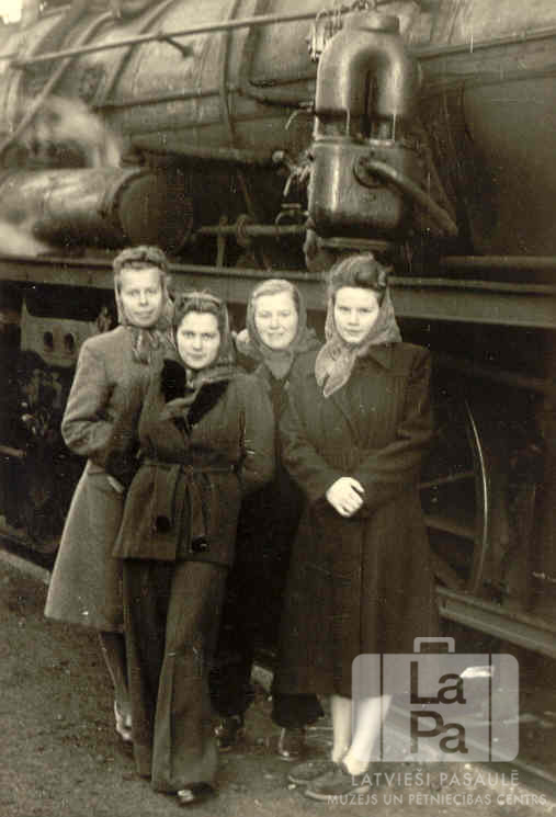 Četras ģimnāzijas audzēknes no Blombergas (angļu zonā) stāv pie vilciena lokomotīves, dodoties uz mājām Braunšveigas nometnē. No kreisās: Austra Tauriņa, Ligita Sproģe (pr. Kalēja), nezināms un Ilga Rozīte.