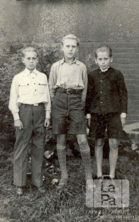 Trīs jauni zēni stāv pie mūra ēkas Braunšveigā (angļu zonā) 1945. gada vasarā. No kreisās: ? Kalnājs, Gundārs Grīslītis un Dzintars Sproģis.