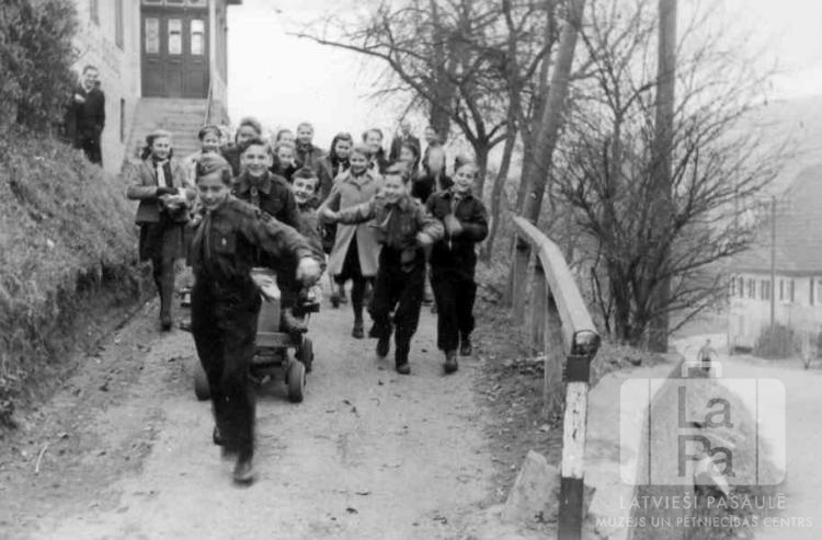 Ogres 38. skautu vienības skauti un Juglas 47. gaidu vienības gaidas no Eslingenes nometnes (amerikāņu zonā) ar ratiem ved kūkas un pašu vāktos gardumus kā svētku dāvanas bijušiem latviešu leģionāriem, kuriem bija jādzīvo prom no galvenās nometnes tā sauktajā "Kalna kolonijā". Bērni dodas lejup pa slīpu ielu. Kreisajā pusē, augšpusē, ir ēka; labajā pusē iela aiziet uz leju.