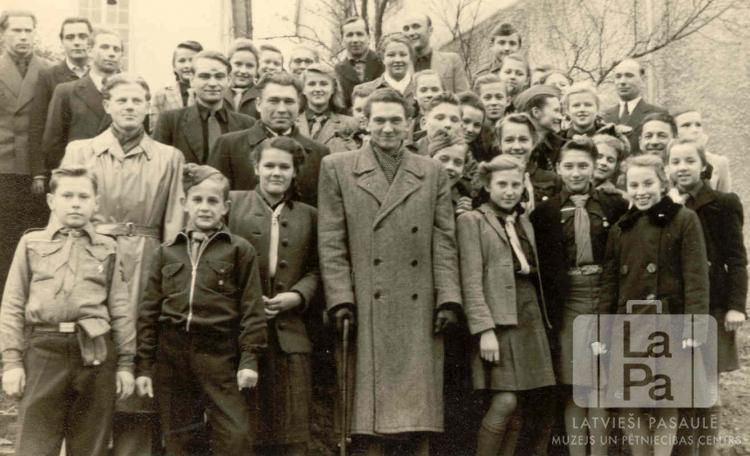 Ogres 38. skautu vienības skauti un Juglas 47. gaidu vienības gaidas no Eslingenes nometnes (amerikāņu zonā) ciemos pie bijušiem latviešu leģionāriem, kuriem bija jādzīvo prom no galvenās nometnes tā sauktajā "Kalna kolonijā". Lielas grupas bilde vairākās rindās. Fonā ēka.