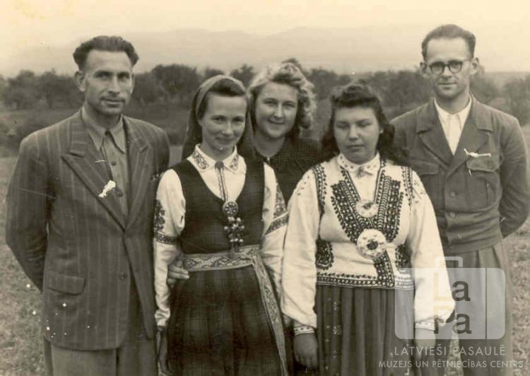Piecu cilvēku grupa Eslingenē (amerikāņu zonā). Priekšā stāv divas sievietes tautastērpos. Priekšā, pirmā no kreisās: Lisete Mirdza Grīna. Par šo gadījumu Lisete Mirdza Grīna atceras: "Gatavojoties latviešu pasākumiem, mēs uzvilkām savus tautas tērpus."