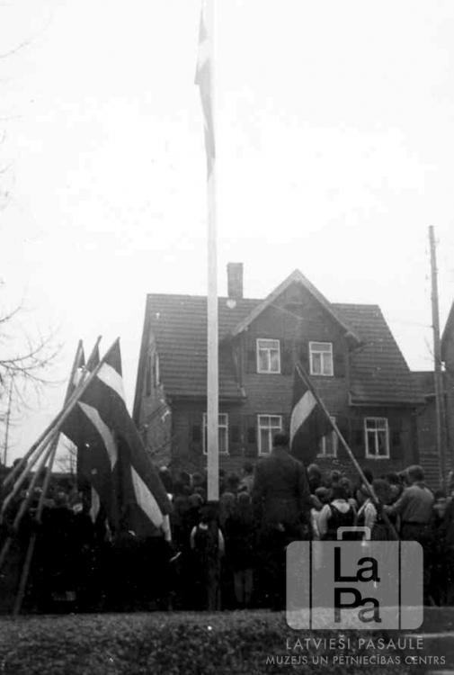 Visas skautu un gaidu vienības no Eslingenes nometnes (amerikāņu zonā) ar saviem Latvijas karogiem sveic nometnes karoga pacelšanu. Augstu mastā ir pacelts Latvijas karogs, tam abās pusēs stāv karognesēji ar citiem Latvijas karogiem. Aiz tiem stāv liels cilvēku pūlis, pagriezies ar muguru. Fonā ir nometnes mūra ēka.