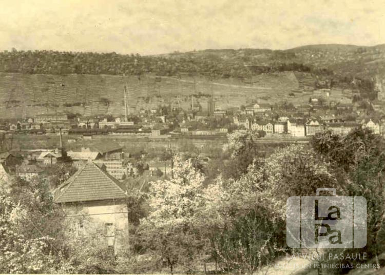 Skats no augšas uz pārvietoto personu nometni Eslingenē (amerikāņu zonā) 1947. gada vasarā. Priekšplānā, uz nogāzes, ir ziedoši koki. Ielejā, labajā pusē, ir redzamas nometnes vairākstāvu mūra ēkas. Ielejas otrā pusē, uz nogāzes, ir vīnogu dārzi.