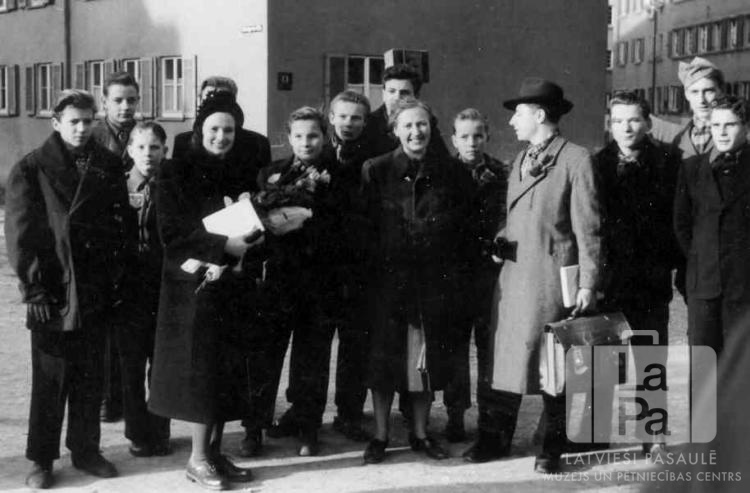 Skauti atvadās no saviem vadītājiem Lisetes Mirdzas un Osvalda Grīniem Eslingenes nometnē (amerikāņu zonā) 1949. gada rudenī, viņiem izceļojot uz ASV. Attēlā redzami Ogres 38. skautu vienības skauti un Erna Cimbule (vadītāja). Priekšā, no kreisās: otrā Lisete Mirdza Grīna (ar puķēm rokās), trešais Osvalds Grīns (gaišā mētelī, ar portfeli rokā).