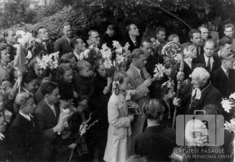 Latvieši apsveic latviešu luterāņu archibīskapu Eslingenes nometnē (amerikāņu zonā) 1947. gada vasarā. Cilvēku procesija ar ziediem. Labajā pusē stāv arhibīskaps Teodors Grīnbergs (mācītāja tērpā, ar scepteri).