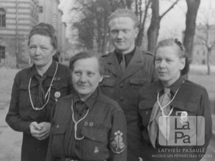 Jauns vīrietis kopā ar gaidu vadītājām formastērpos Eslingenē (amerikāņu zonā). Fonā ir iela, koku un mūra ēku rindas. Priekšā: Elizabete Laufere (latviešu gaidu priekšniece vadītāja).