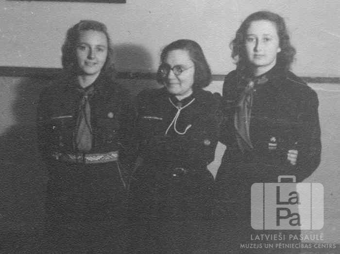 Viesītes 49. gaidu vienības lielgaidas ar savu vadītāju Eslingenē (amerikāņu zonā). Visas trīs sievietes stāv gaidu formastērpos. Otrā no kreisās: vadītāja Marija Saliņa.
