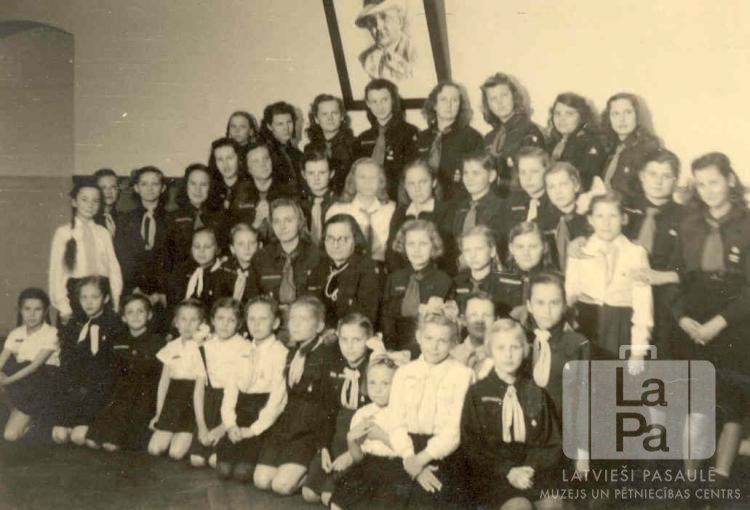 Viesītes 49. gaidu vienība Eslingenes nometnē (amerikāņu zonā). Gaidas un vadītājas vairākās rindās, visas ir ģērbušās formastērpos. Fonā uz sienas ir vīrieša portrets. Šī bija viena no trim gaidu vienībām šajā nometnē. Otrajā rindā, vidū, ir redzama vienības priekšniece vadītāja Marija Saliņa.