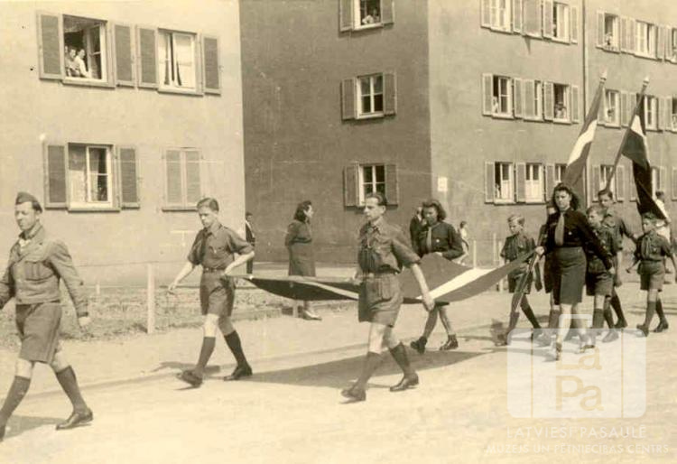 Skauti un gaidas ienes Latvijas karogus Daugavas skautu novada trīs vienības skautu dienas parādē Eslingenes nometnē (amerikāņu zonā) 1947. gada vasarā. Aizmugurē divas vairākstāvu mūra ēkas; pie vairākiem logiem ir redzami cilvēki. Skautu dienā piedalījās Daugavas skautu novada trīs vienības – Pērses 37., Ogres 38. un Aiviekstes 39. skautu vienība.