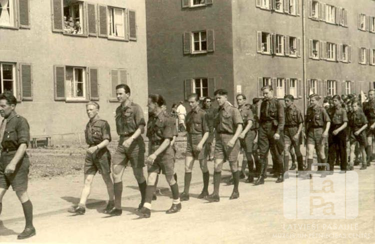 Aiviekstes 39. skautu vienība soļo skautu dienas parādē Eslingenes nometnē (amerikāņu zonā) 1947. gada vasarā. Aizmugurē divas vairākstāvu mūra ēkas; pie vairākiem logiem ir redzami cilvēki. Skautu dienā piedalījās Daugavas skautu novada trīs vienības – Pērses 37., Ogres 38. un Aiviekstes 39. skautu vienība.