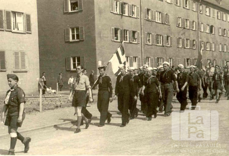 Igauņu skauti soļo skautu dienas parādē Eslingenes nometnē (amerikāņu zonā) 1947. gada vasarā. Gājiena priekšgalā soļo karognesējs. Aizmugurē ir divas vairākstāvu mūra ēkas; pie vairākiem logiem ir redzami cilvēki. Skautu dienā piedalījās Daugavas skautu novada trīs vienības – Pērses 37., Ogres 38. un Aiviekstes 39. skautu vienība.