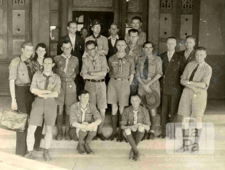 Daugavas skautu novada vadītāji pie ēkas ieejas