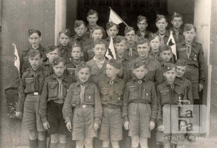 Ogres 38. skautu vienības skautu pulks ar vadītājiem Eslingenes nometnē (amerikāņu zonā). Visi stāv vairākās rindās, ģērbušies formastērpos. Pirmajā rindā, pirmais no kreisās: Juris Mūrnieks (ar gaišu kaklautu). Otrajā rindā, no kreisās: otrais Osvalds Grīns (vadītājs) un trešais Fricis Jansons (vadītājs). Viņiem pa vidu ir redzams Juris Jansons (ar karogu). Ceturtajā rindā, pirmais no kreisās: Torilds Barbins (ar karogu).