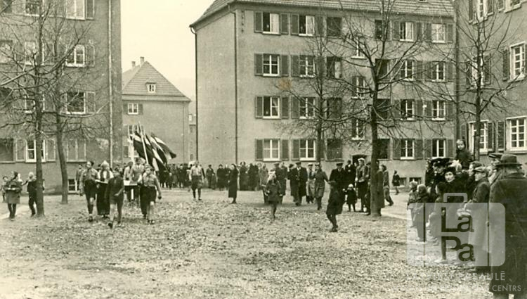 Pērses 37. skautu vienība ar plīvojošiem Latvijas karogiem nes Eslingenes nometnes (amerikāņu zonā) Latvijas karogu. Apkārt stāv skatītāji, un ir redzamas vairākstāvu mūra ēkas.