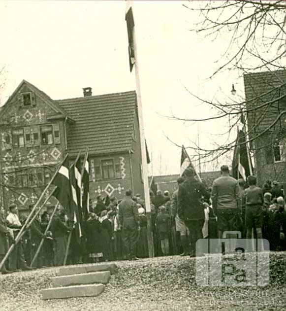 Apmeklētāji Latvijas Valsts neatkarības atzīmēšanas gadadienā Eslingenes nometnē (amerikāņu zonā). Mastā plīvo Latvijas karogs, tā pakājē ir pasākuma apmeklētāji. Kreisajā pusē jaunieši tur vairākus Latvijas karogus. Visi cilvēki ir pagriezuši muguras. Apkārt ir vairākstāvu mūra ēkas.