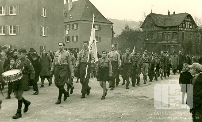 Pērses 37. skautu vienība formastērpos ar savu jauno, balto vienības karogu soļo uz savu mītni Eslingenes nometnē (amerikāņu zonā). Priekšgalā soļo bundzinieks. Vienība karogu saņēma pēc Valsts svētku atklāšanas. Apkārt sastājušies skatītāji, fonā ir vairākstāvu mūra ēkas.