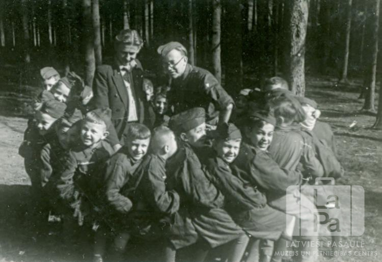 Pērses 37. skautu vienības mazskautu pulks no Eslingenes nometnes (amerikāņu zonā) iet rotaļās meža malā. Visi zēni ir ģērbušies formastērpos un aplī sēž viens otram uz ceļiem. Viņu vidū stāv divi jaunieši.