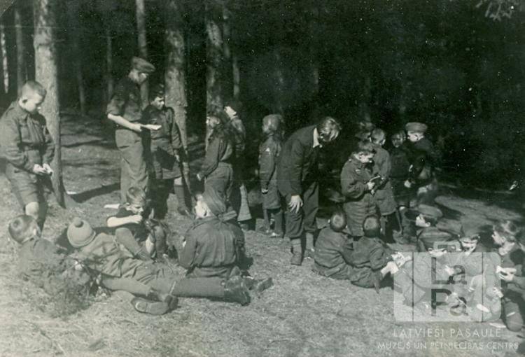 Pērses 37. skautu vienības mazskautu pulks no Eslingenes nometnes (amerikāņu zonā) āra nodarbībā meža malā. Visi zēni ir ģērbušies formastērpos. Daži sēž, citi stāv kājās.