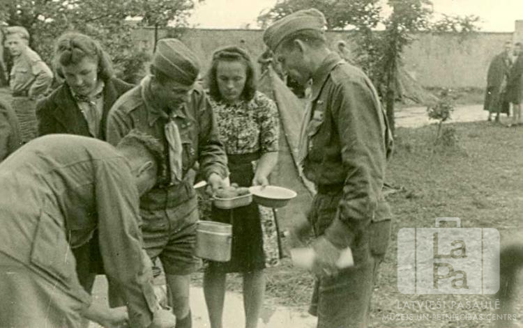 Cilvēki ar traukiem rokā Memmingenē (amerikāņu zonā). Vairāki vīrieši ir ģērbušies skautu formastērpos. Par šo gadījumu Lisete Mirdza Grīna atceras: "Lai izstrādātu trimdas darbības noteikumus un izveidotu jaunu vadītāju kursus, 1945. un 1946. gadā noturēja vairākas konferences. Šī jau bija 5. kopš kaŗa beigām."