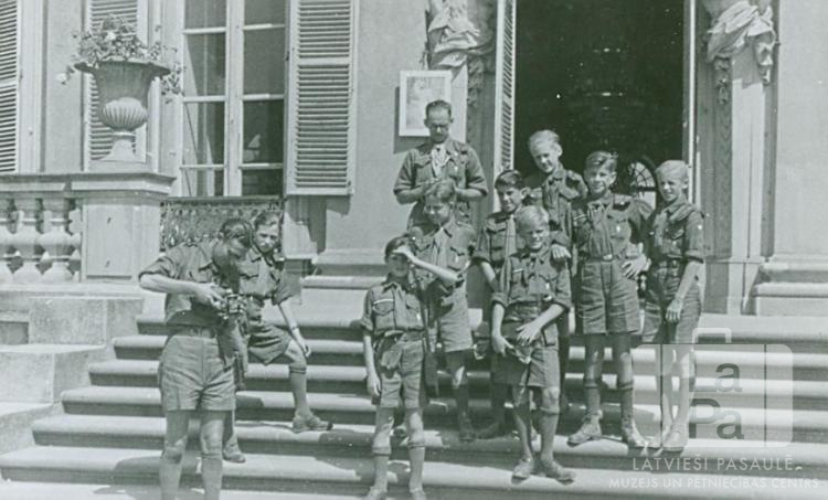 Pērses 37. skautu vienība no Eslingenes nometnes pētniecības sirojuma laikā uz Lūdvigsburgas pils kāpnēm (amerikāņu zonā). Visi zēni un vīrieši ir ģērbušies formastērpos. Fonā atvērtas ieejas durvis.