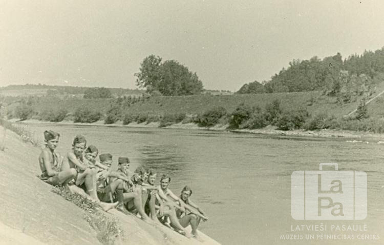 Pērses 37. skautu vienība no Eslingenes nometnes pētniecības sirojuma laikā Nekāras upes krastā pie Lūdvigsburgas (amerikāņu zonā). Visi zēni un vīrieši ir ģērbušies formastērpos. Fonā upe un tās otrs krasts ar laukiem un mežiem.