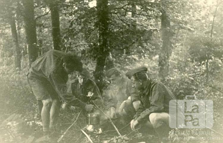 Pērses 37. skautu vienības roveru dzimta no Eslingenes nometnes (amerikāņu zonā) sirojuma laikā brokasto "Gelber-Fels" mežā pie Tekas pils ("Burg Teck") drupām. Četri puiši formastērpos darbojas ap ugunskuru, virs kura ir uzkārts mazs katls.
