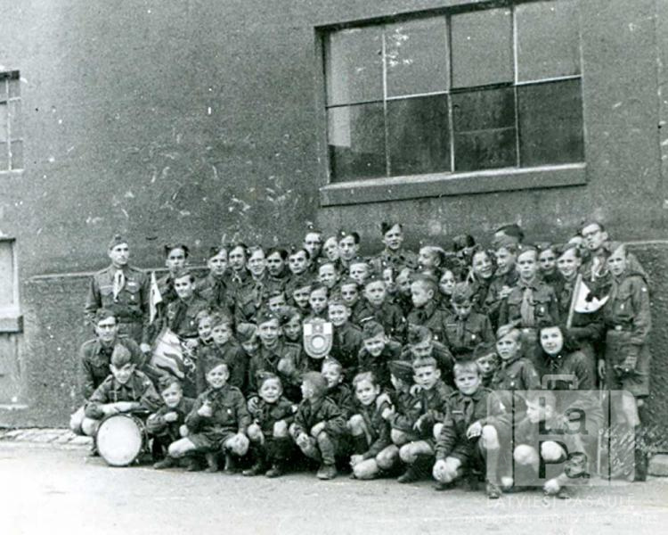 Pērses 37. skautu vienība pie ēkas sienas Eslingenes nometnē (amerikāņu zonā) 1946. gada rudenī. Skautu grupa vairākās rindās. Visi ir ģērbušies formastērpos. Zēni grupas vidū rokās tur mazu vairogu, citi tur mazus karogus un bungas.