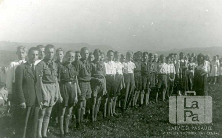 Skauti un gaidas no Gepingenes nometnes (amerikāņu zonā) stāv divās rindās kopnieku kursu laikā. Grupā ir arī Pērses 37. skautu vienība, kas tālāk darbojās Eslingenes bēgļu nometnē. Fonā ir ainava ar kalniem. Pirmās rindas galā ir redzamas jaunietes tautastērpos. Priekšplānā, pirmajā rindā pirmais no kreisās: G. Rošāns (virskopnieks).