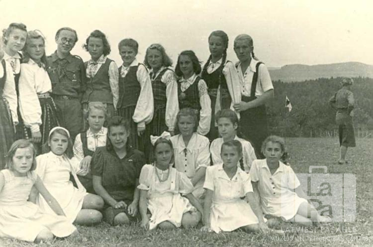 Gaidu grupa no Gepingenes nometnes (amerikāņu zonā). Priekšā gaidas sēž zālē, aizmugurē jaunietes stāv kājās. Vairākas jaunietes ir ģērbušās tautastērpos. Grupā ir redzams arī viens skauts. Šī gaidu vienība tālāk darbojās Eslingenes bēgļu nometnē. Fonā ir ainava ar mežiem un pauguriem. Aizmugurē, trešais no kreisās: G. Arbeits (skautu kopnieks).