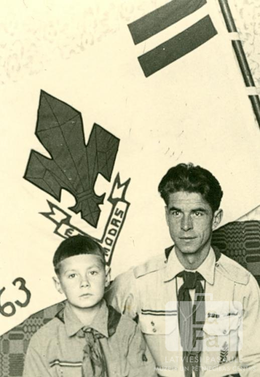 Baltezera 63. skautu vienības vadītājs un skauts pie vienības karoga Memmingenes nometnē (amerikāņu zonā). Uz gaiša karoga ir uzzīmēts Latvijas karogs, kā arī emblēma ar vārdu "MODRS".
