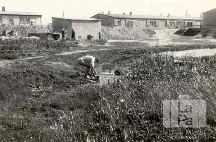 Vīrietis smeļ ūdeni no dīķa Herenvikas nometnē Lībekā (angļu zonā) 1946. gada vasarā. Aizmugurē divi cilvēki stāv pie vienstāvu ēkas, aiz tās, uz uzbēruma, ir redzamas vēl vairākas vienstāvu barakas.