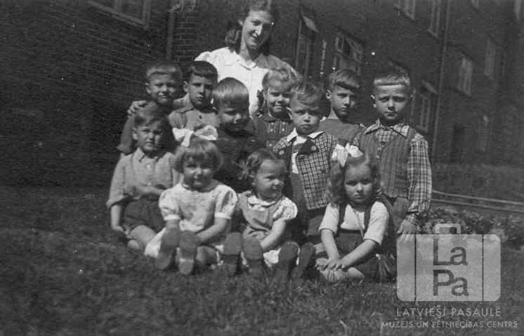 Bērnudārza bērni ar audzinātāju Lībekā (angļu zonā) 1946. gada rudenī. Fonā ir kādas nometnes dzīvojamās ēkas. Iespējams, cilvēku grupa atradās uz Marli ielas (Marli Strasse). Grupas aizmugurē stāv sieviete, iespējams, audzinātāja. Priekšā, pirmā no labās: Rita Sprūdža. Otrajā rindā, pirmais no kreisās: Marģers Raudzēns. Trešajā rindā, trešā no kreisās puses: Livija Raudēna.