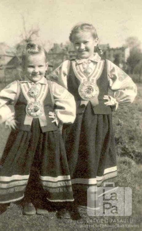 Divas māsas tautastērpos Valderzē nometnē Lībekā (angļu zonā). Fonā lauks, tālumā ēkas. No kreisās: ? Garlandere un Ilze Garlandere.