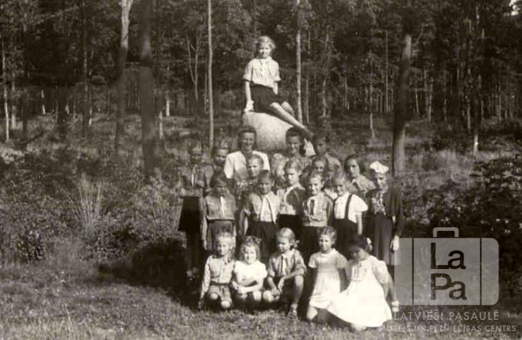 Liepavota 3. gaidu vienības guntiņas no Mēsenes nometnes Lībekā (angļu zonā) stāv meža malā pēc āra rotaļām 1948. gada vasarā. Daudzas meitenes ir ģērbušās formastērpos; viena meitene aizmugurē sēž uz augsta akmens. Pirmajā rindā, no kreisās: pirmā Maija Ķepīte, otrā Ligita Eignere, trešā Vaira Vīķe (pr. Freiberga). Otrajā rindā, no kreisās: Inta Lācīte, Biruta Trokša, Baiba Puriņa, Anda Sidraba, Guna Aistere un Beatrise Eglāja. Trešajā rindā redzamas: Baiba ? (vadītājas ? Delles priekšā), Ilga Vecgrāve (aiz Gunas Aisteres). Ceturtajā rindā, pirmā no kreisās: Ruta Lāma. Ceturtajā rindā vēl redzamas: Biruta Bērziņa (vadītāja), Vija Bangerska (lielgaida), Mirdza ?, ? Delle (vadītāja). Aizmugurē uz akmens sēž: Mudīte Liekne.