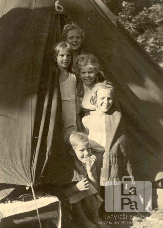 Liepavota 3. gaidu vienības guntiņas no Mēsenes nometnes Lībekā (angļu zonā) pie savas telts ieejas vasaras nometnē pie Pansdorfas. No apakšas: Maija Čūle, Vaida Grienvalde Samoviča, Livija Raudzēna (pr. Kent), Inta Lācīte un Rasma Brūna.