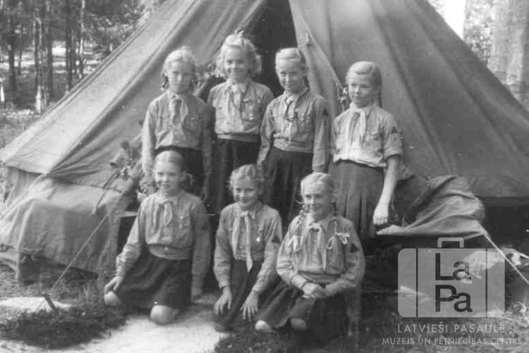 Liepavota 3. gaidu vienības guntiņas no Mēsenes nometnes Lībekā (angļu zonā) pie savas telts ieejas vasaras nometnē pie Pansdorfas. Visas meitenes ir ģērbušās formastērpos. Fonā mežs. Priekšā sēž, no kreisās: Vaira Vīķe (pr. Kent), Biruta Trokša un Guna Aistere. Otrajā rindā stāv, no kreisās: Baiba Puriņa, nezināms, Ruta Lāma un Mudīte Liekne.