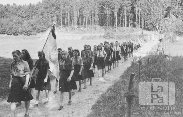 Liepavota 3. gaidu vienība no Mēsenes nometnes Lībekā (angļu zonā) soļo mājās no vasaras nometnes. Visas sievietes un meitenes formastērpos soļo garā kolonnā pa šauru lauku ceļu. Priekšgalā soļo vadītāja, aiz viņas tiek nests karogs. Priekšplānā, labajā pusē, ir žogs. Aiz gaidu kolonnas ir lauks un mežs. Kreisajā pusē, gājienā pirmā: Olga Medeniece (vadītāja). Aiz viņas otrajā rindā, no kreisās: Vija Blumfelde, Dzintra Krūmkalne (karoga nesēja) un Edīte Balode. Trešajā rindā, no kreisās: Biruta Mikus un Marija Jesčenko. Piektajā rindā ir redzama Ilona Lūkina (ar gaišo kreklu un nūju). Sestajā rindā ir redzama Ģertrūde Lediņa.