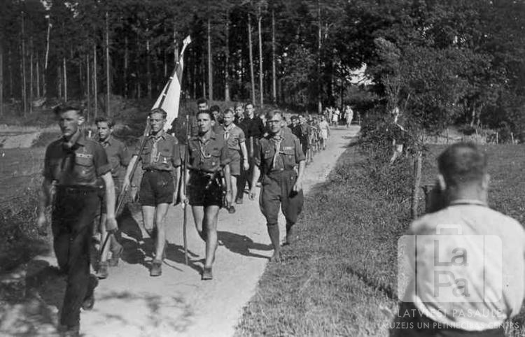 Staburaga 1. skautu vienība no Mēsenes nometnes Lībekā (angļu zonā) soļo mājās no vasaras nometnes. Vīrieši formastērpos soļo garā kolonnā pa šauru lauku ceļu. Priekšgalā tiek nests karogs. Priekšplānā, labajā pusē, ir žogs. Aiz skautu kolonnas ir lauks un mežs. Kreisajā pusē, gājienā pirmais: Rolands Neijs. Aiz viņa otrajā rindā, no kreisās: otrais Vilnis Balodis (karognesējs) un Uldis Liepiņš. Priekšā, labajā pusē stāv Jūlijs Medenieks (vadītājs; pagriezies ar muguru).