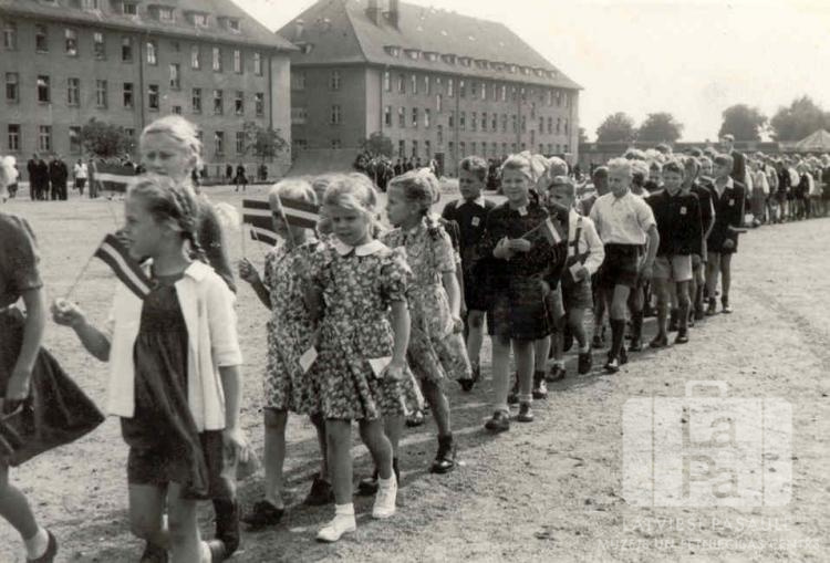 Bērni dodas skolas gada iesākuma gājienā Mēsenes nometnē Lībekā (angļu zonā). Rokās skolēniem ir mazi Latvijas karogi. Fonā plašs laukums, skatītāji un trīsstāvu mūra ēkas. Priekšplānā redzamas meitenes: Livija Raudzēna (pr. Kent), Baiba ?, Aina Kalniņa, Žeraldīne Silkalne, Maija Ķepīte (aiz Ainas Kalniņas). Kolonnā redzamie pirmie zēni, no kreisās: Kārlis Liepiņš, Ansis Kaņeps.