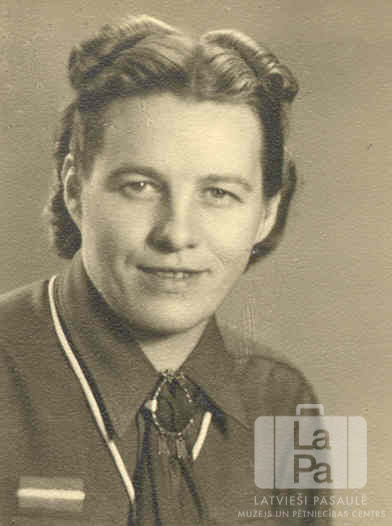 Liepavota 3. gaidu vienības vadītājas Olgas Medenieces portrets Lībekā (angļu zonā). Sieviete ģērbusies formastērpā.
