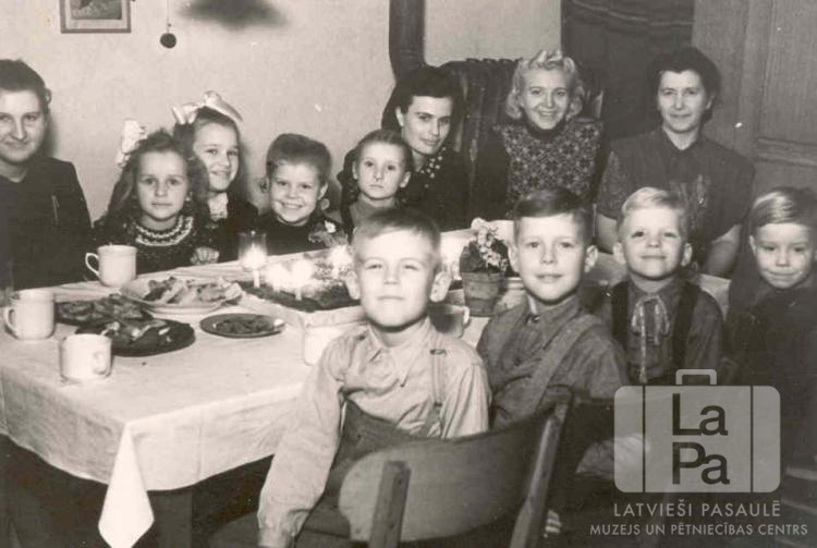 Bērni ar vecākiem sēž pie svētku galda dzimšanas dienas svinībās Mēsenes nometnē Lībekā (angļu zonā). Uz galda ir trauki, ēdiens un kūka ar svecēm. Galda priekšā sēž, no kreisās: Aivars ?, Ints Rupners, Jānis Puķe un Marģers Raudzens. Aiz galda sēž, no kreisās: Livija Puķe, Rita Sprūdža, Vaida Grienvalde Samoviča, Livija Raudzēna (pr. Kent), Daina Feldmane, nezināms, Inga Puķe un Verēna Freija.