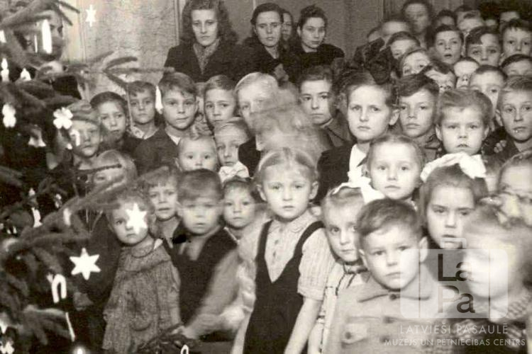 Pamatskolas un bērnudārza Ziemassvētku sarīkojums Mēsenes nometnē Lībekā (angļu zonā). Liela bērnu grupa; aizmugurē, pie telpas sienām, ir redzamas sievietes. Kreisajā pusē ir izdekorēta svētku egle.