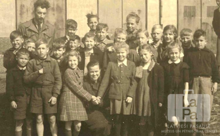 Latviešu pamatskolas 3. klases skolēni ar skolotājiem Mēsenes nometnē Lībekā (angļu zonā) 1949. gada pavasarī. Pirmajā rindā divas meitenes sarokojas. Fonā ēka. Pirmajā rindā, no kreisās: Ansis Kaņeps, nezināms, Ligita Eignere, ? Timmermanis (skolotāja), Livija Raudzēna (pr. Kent), Maija Čūle, Maija Ķepīte un Zigurds Eigners. Otrajā rindā, no kreisās: nezināms, nezināms, Andris Zutis, Aleksandrs Briedaks, Aina Kalniņa, Žeraldīne Silkalne, Mirdza Plostiņa un nezināms. Trešajā rindā, trešais no kreisās: Ojārs Lūre. Ceturtajā rindā, pirmais no kreisās: A. Trokšs (skolotājs).
