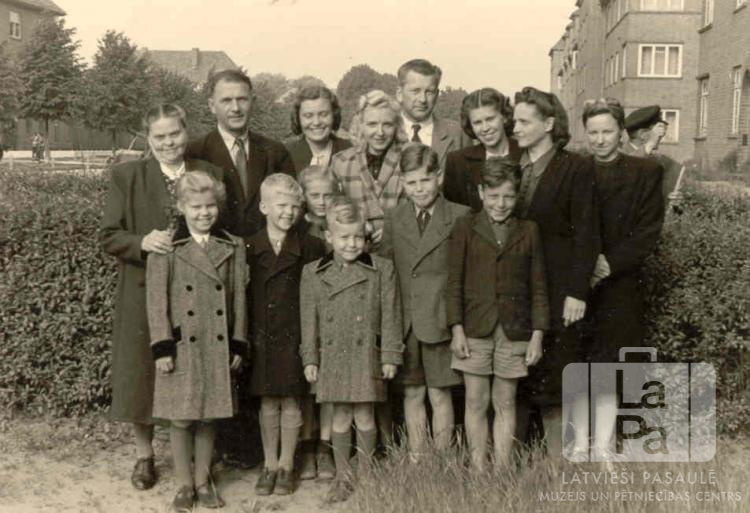 Raudzēnu ģimene ar draugiem savā pēdējā dienā Valderzē nometnē Lībekā (angļu zonā), pirms izceļošanas uz ASV. Fonā dzīvžogs, koku rinda un mūra ēkas. Priekšā, no kreisās: Livija Raudzēna (pr. Kent), Jānis Puķe, Maija Ķepīte, Marģers Raudzēns, Vidvuds Raudzēns un Kārlis Liepiņš. Aizmugurē, no kreisās: Trīne Birže, Eižens Puķe, Zigrīda Raudzēna, Inga Puķe, Otto Grunde (mākslinieks), Ausma Dienava, ? Dauguļa (Daugule ?) un Ērika Grunde.