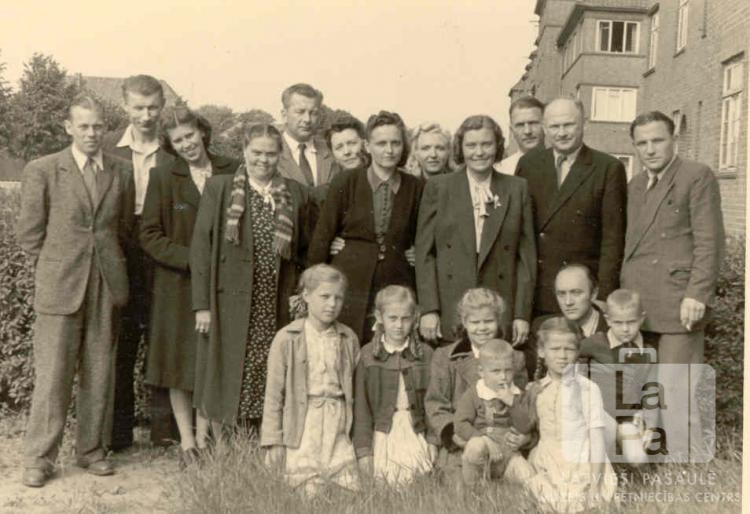 Raudzēnu ģimene ar draugiem savā pēdējā dienā Valderzē nometnē Lībekā (angļu zonā), pirms izceļošanas uz ASV. Fonā dzīvžogs, koku rinda un mūra ēkas. Priekšā, no kreisās: Mirdza Plostiņa, Maija Ķepīte, Livija Raudzēna (pr. Kent), Aldis Zuika (mazais zēns klēpī L. Raudzēnai), Maija Čūle, Roberts Zuika (diriģents) un Māris Zuika. Aizmugurē stāv, no kreisās: ? Reimanis, V. Buņķis, Ausma Dienava, Trīne Birže, Otto Grunde, Verēna Freija, ? Dauguļa (Daugule ?), Inga Puķe, Zigrīda Raudzēna, Eižens Puķe, Viktors Teteris un Aleksandrs Puriņš.