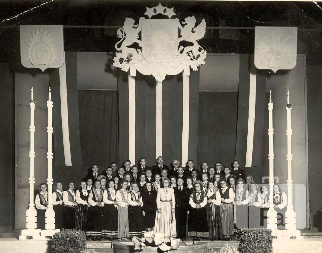 Jauktais koris Centrālajā nometnē Vircburgā (amerikāņu zonā) Latvijas neatkarības gadadienas svētku aktā. Sievietes ir ģērbušies tautastērpos. Skatuve ir izdekorēta ar Latvijas karogiem un Latvijas ģerboni. Pirmajā rindā, no kreisās: desmitā Lilija Štengele (māksliniece, gaišā kleitā), vienpadsmitais Pēteris Banders (diriģents). Koristu vidū ir redzami: Elza Lamba, A. Freide, I. Kanaviņa, E. Silkalna, Gulbe, V. Varslavāne, I. Zālīte, I. Bembere, A. Strīķe, E. Rocēna, Z. Pīlmane, J Būda, Pāpe, M. Bērziņš, A. Bruniņš, M. Kalniņš, J. Polis, A. Vanags, Jurjāns, P. Austriņš, Purviņš, V. Ozoliņš, A. Indriksons, J. Petzālis, H. Cīrulis, A. Grīva un D. Lamba. Foto autors: J. Kreilis.